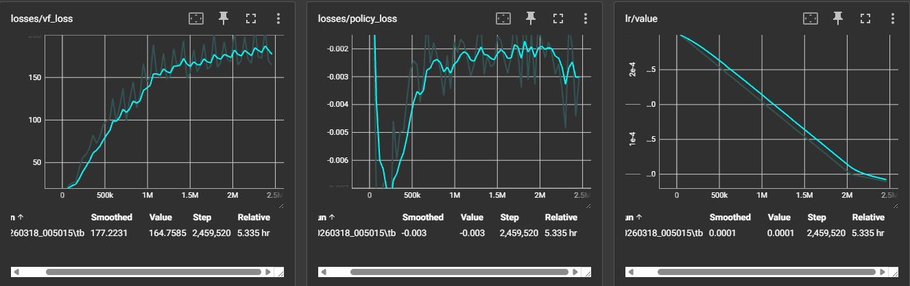 조기 종료 판단: lr 스케줄러가 0에 도달하고 reward가 평탄화(plateau)에 진입한 2.4M 스텝에서 학습을 종료했습니다.
