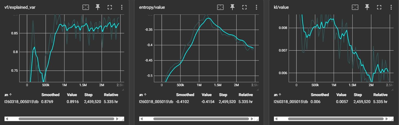 | vf/explained_var | 0.87 | Critic이 미래 보상의 87%를 설명 — 높은 상태 가치 예측력 |